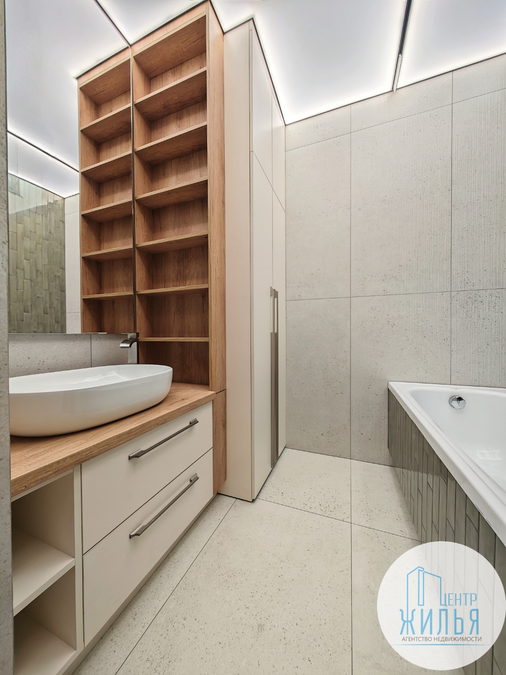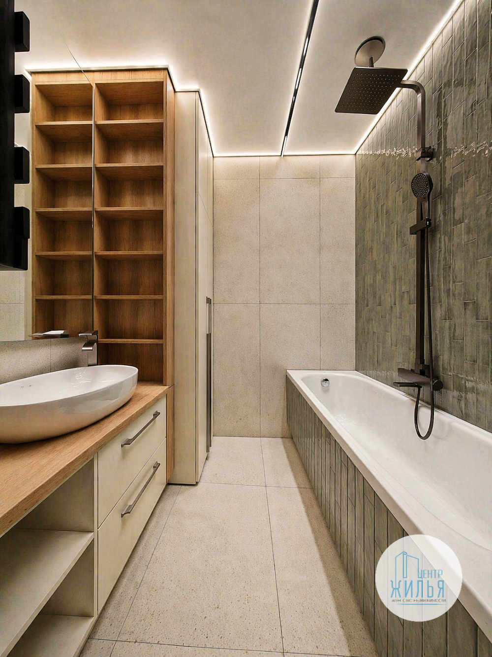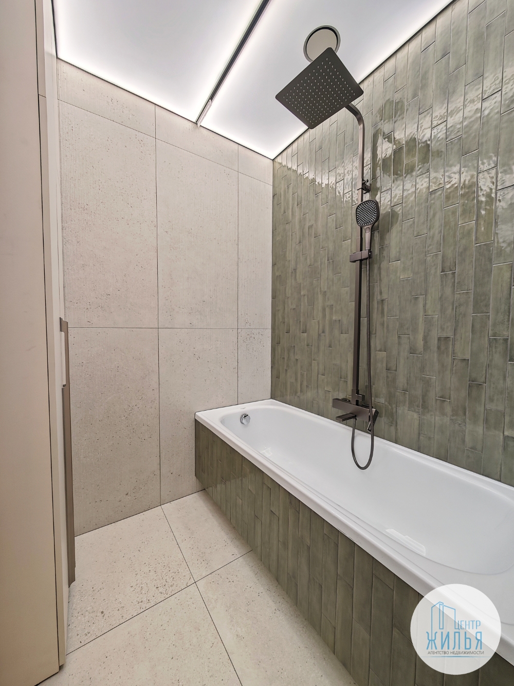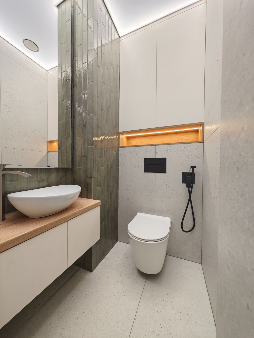 В санузлах использовалась коллекционная испанская плитка Geotiles Ceramica, душевая система Gappa, инсталляция AlcaPlast, теплый электрический пол, установлен бойлер Electrolux на 50 литров, в туалете предусмотрен рукомойник и гигиенический душ.