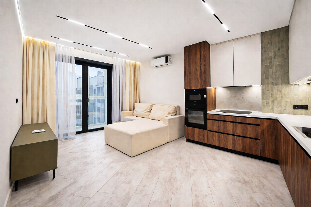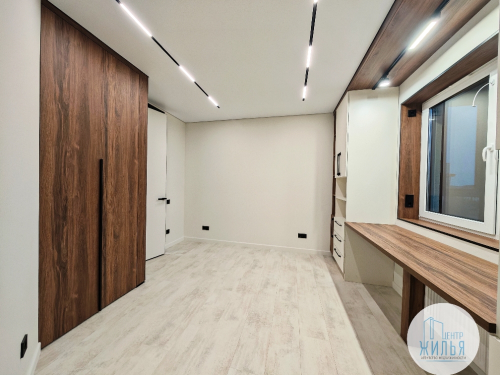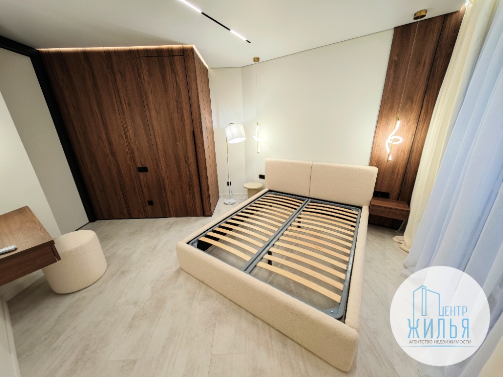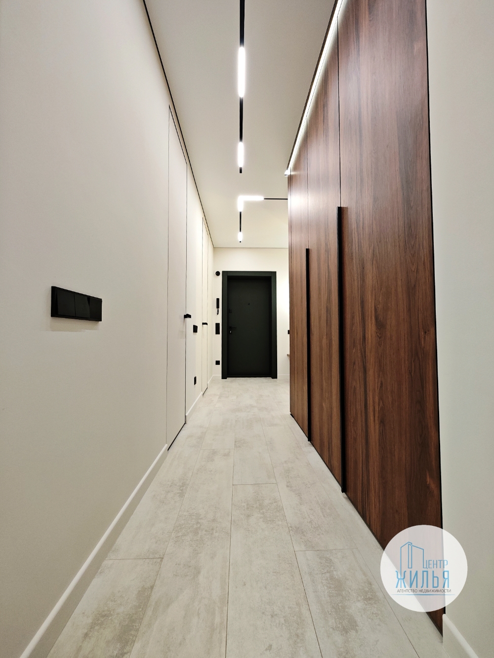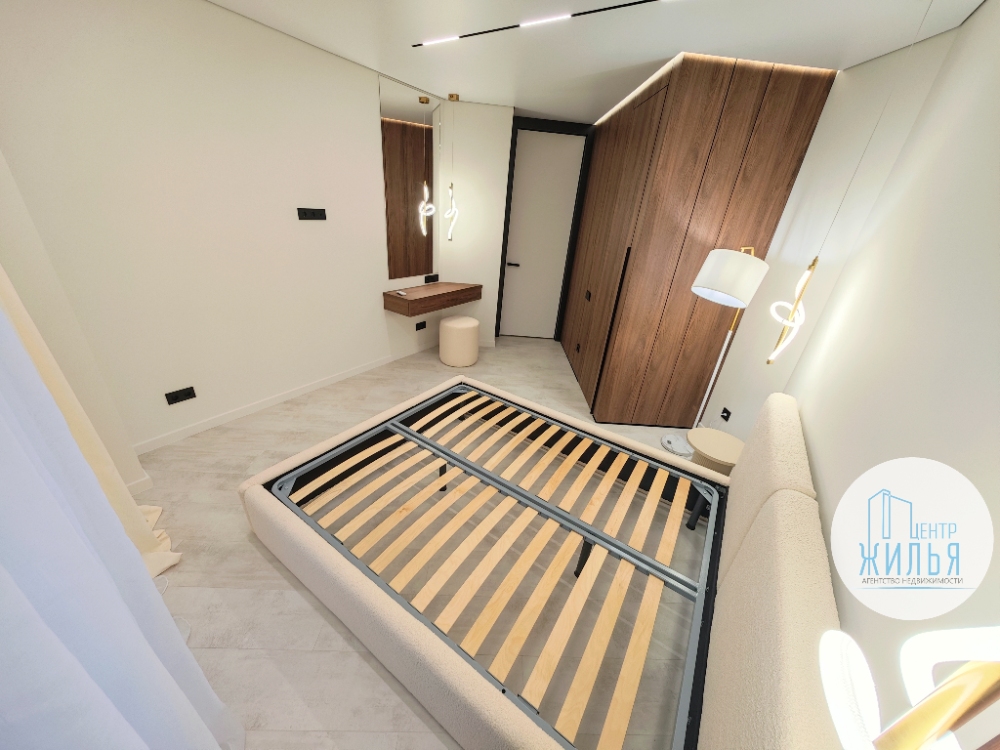 Для максимального комфорта предусмотрены электрокарнизы с управлением от пульта и голосового помощника Алиса, а также инверторный кондиционер с управлением с пульта или через Алису. Освещение реализовано на современной магнитной трековой системе.