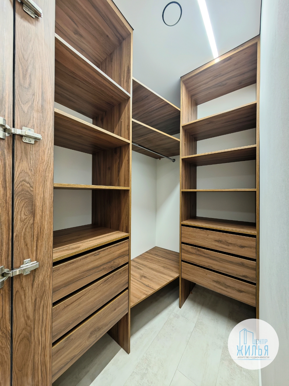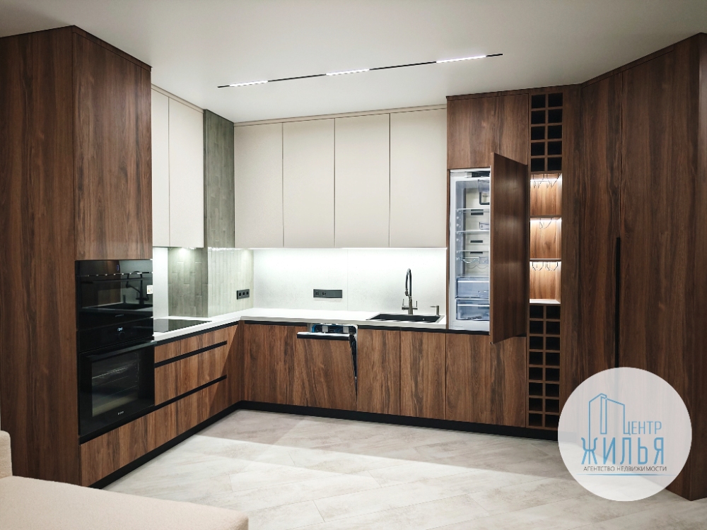 Кухня, шкафы, гардеробная, выполнены из МДФ-панелей Egger одного вида во всей квартире, объединяя пространство в единую целостную картину, фурнитура с доводчиками. Встроенная бытовая техника включает индукционную варочную поверхность, духовой шкаф, СВЧ-печь, посудомоечную машину 45 см шириной и холодильник. Предусмотрен удобный американский шкаф для хранения. Установлен фильтр питьевой воды Аквабрайт.