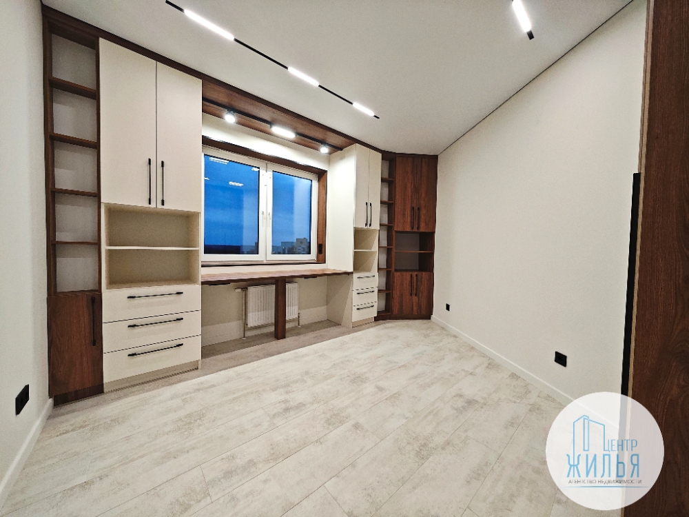 Во второй спальне организовано просторное рабочее место, места хранения организованы продуманными шкафами и стеллажами.