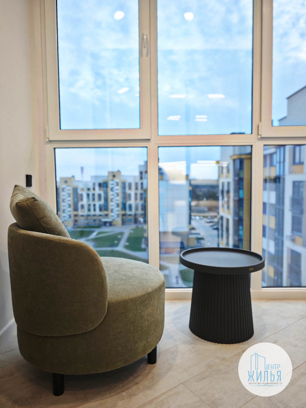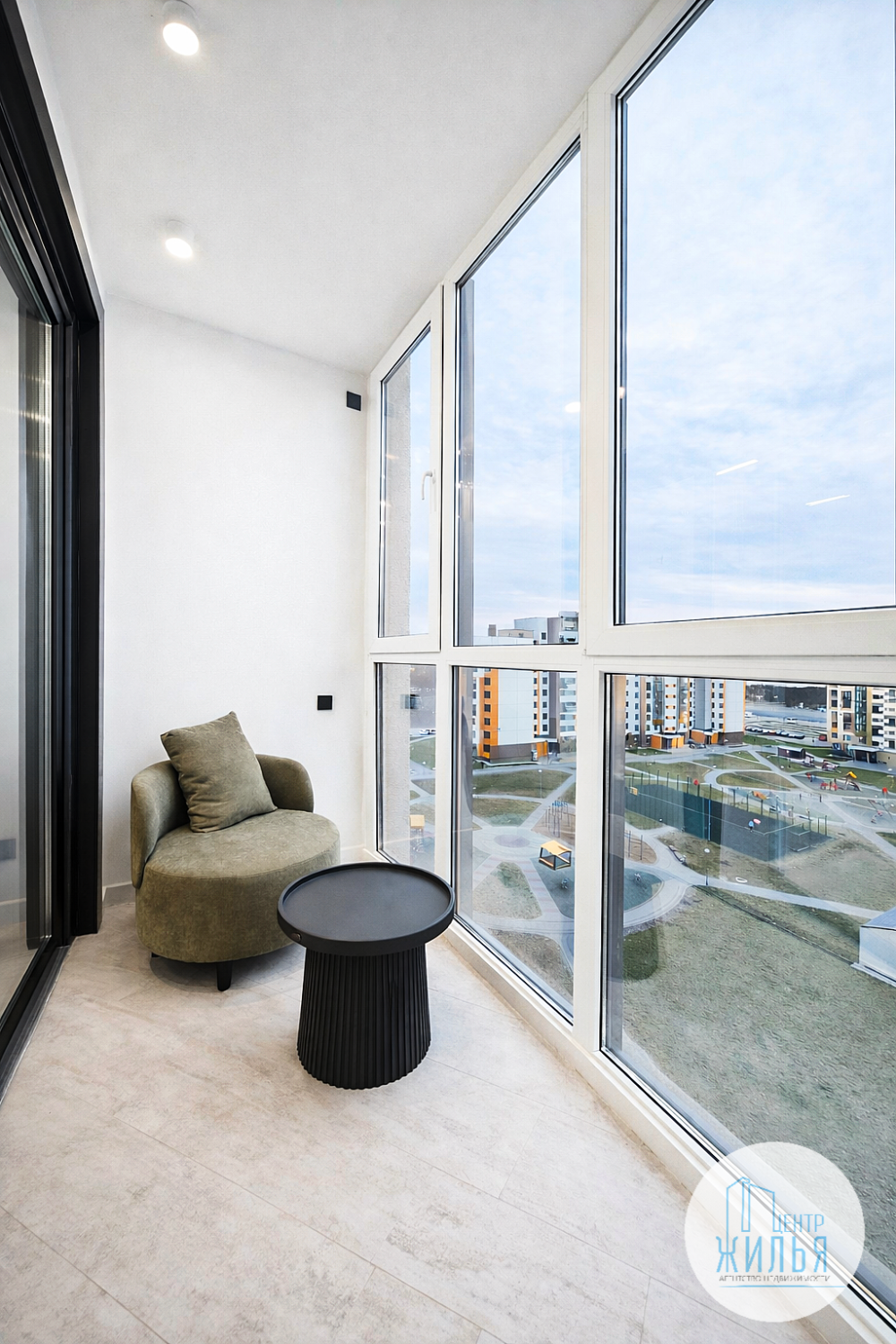 Выход на лоджию организован 2 распашными французскими окнами с ламинацией, наполняющими гостиную светом. На лоджии панорамное остекление, установлен инфракрасный теплый пол, предусмотрено освещение и розетка для гирлянды, это станет вашим любимым местом для утреннего кофе.