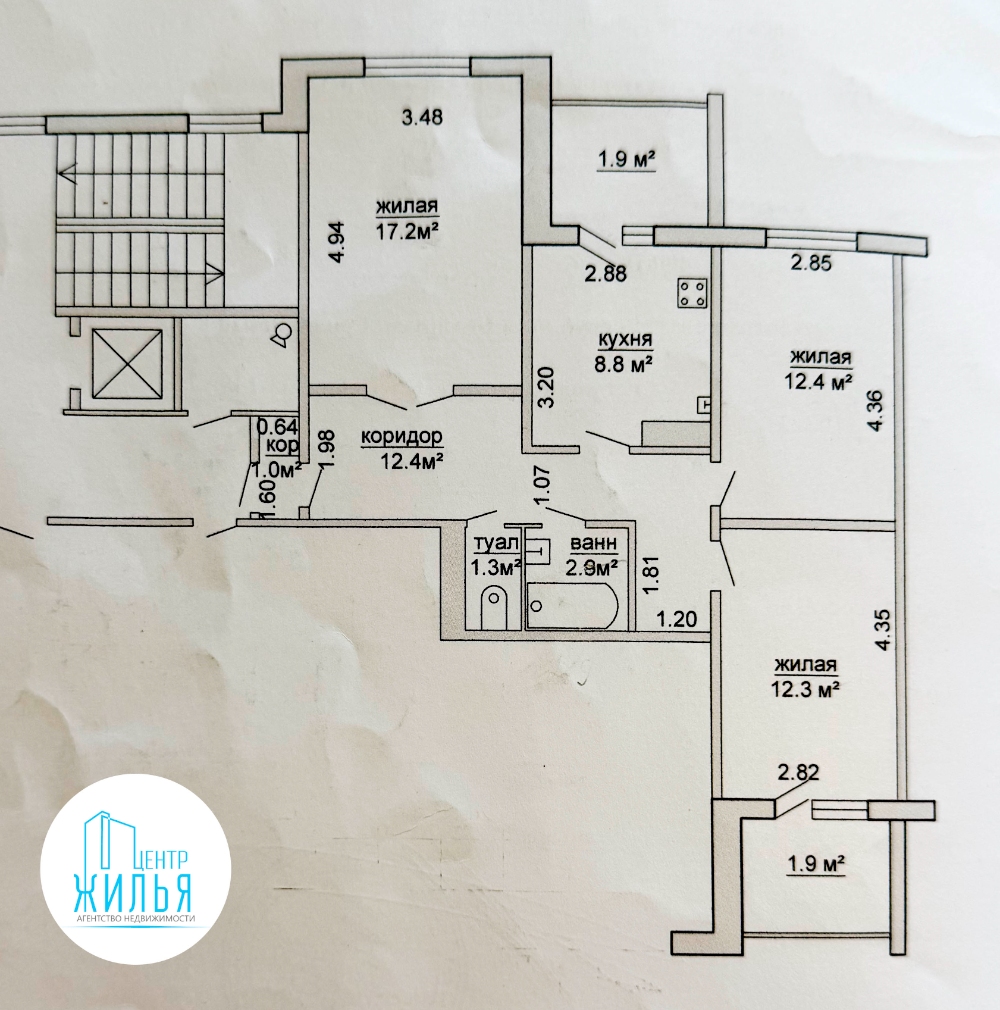 Общая площадь квартиры составляет 68,3 кв.м. (площадь по СНБ – 72,1 кв.м., в т.ч.: гостиная – 17,2 кв.м., две спальни по 12,4 и 12,3 кв.м. каждая, кухня – 8,8 кв.м.