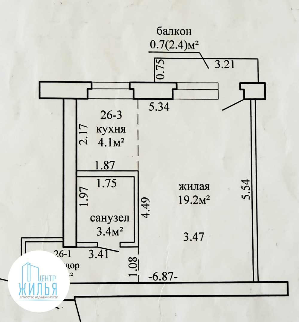 Общая площадь квартиры составляет 30,6 кв.м. (площадь по СНБ – 31,3 кв.м.), в т.ч.: жилая – 19,2 кв.м.